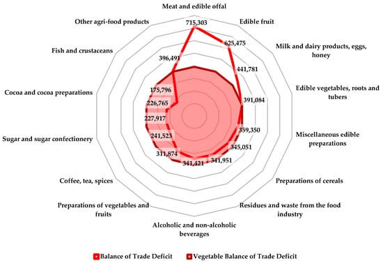 The impact of the Romanian trade balance concerning the vegetable chain in the national trade balance for agri-food products was considerable, especially in 2020, characterized by a deficit of 391,059 thousand EUR, the fourth-most important source of Romania’s trade balance deficit for agri-food products. With respect to the structure of the trade balance deficit in Romania in 2020 in the case of the 24 agri-food product categories as defined in the Combined Nomenclature [94], Figure 1 was elaborated with the aim of showing the most affected agri-food chains in the face of national market demand and current production conditions. Of the 24 categories, half of them, which accounted for almost 90% of Romania’s agri-food trade balance deficit in 2020, were included in Figure 1. Vegetables are at the top of the ranking of deficit sources.