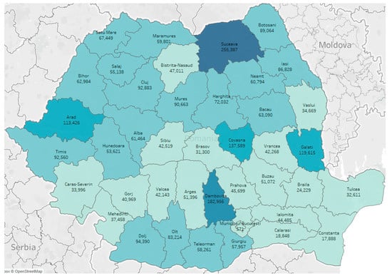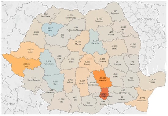 Romania’s trade balance deficit for vegetables, per county, in 2020. Source: authors’ own graphical representation.