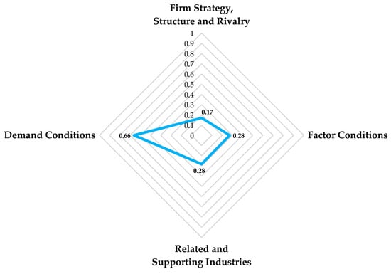 Porter’s diamond model applied at the level of Romanian counties—average per diamond attribute. Source: authors’ own calculations based on data from Table 8.