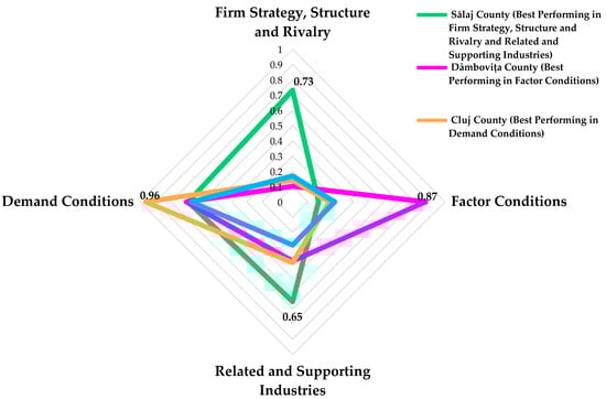 Best-performing Romanian counties in relation to Porter’s diamond model attributes. Source: authors’ own graphical representation and design based on data from Table 8.