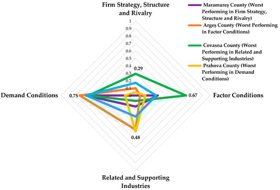 Worst-performing Romanian counties in relation to Porter’s diamond model attributes. Source: authors’ own graphical representation based on data from Table 8.