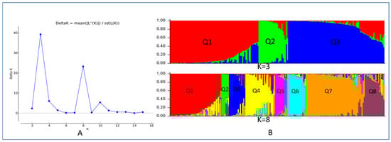 - Pritchard, J.K.; Stephens, M.; Donnelly, P. Inference of population structure using multilocus genotype data. Genetics 2000, 155, 945–959. [Google Scholar] [CrossRef] [PubMed]