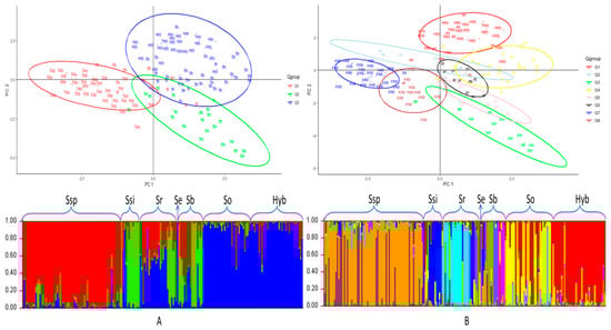 - Ali, A.; Pan, Y.-B.; Wang, Q.-N.; Wang, J.-D.; Chen, J.-L.; Gao, S.-J. Genetic diversity and population structure analysis of Saccharum and Erianthus genera using microsatellite (SSR) markers. Sci. Rep. 2019, 9, 395. [Google Scholar] [CrossRef] [Green Version]