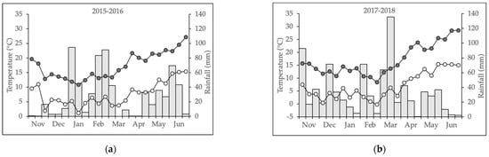 Air minimum (white dots) and maximum (black dots) temperatures and rainfall (bars) in the two cropping seasons: (a) 2014–2015; (b) 2015–2016.