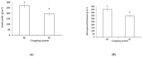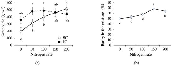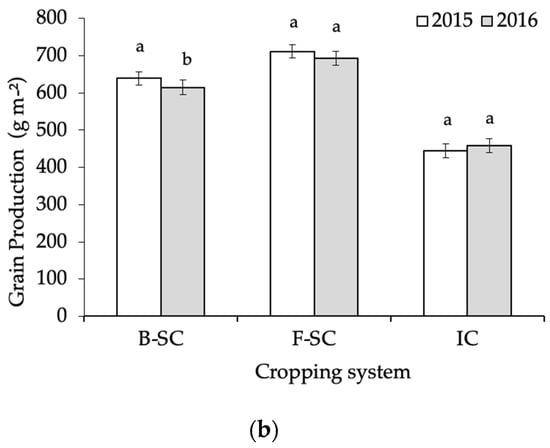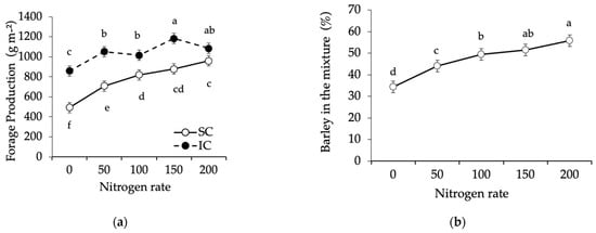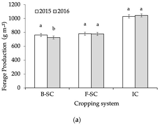 Year × cropping system interaction effect on (a) forage production and (b) grain production. Values are means of two harvesting stages, five N rates, and three replicates. Vertical lines represent HSD and values with the same letter are not statistically different for p ≤ 0.05. B-SC: barley sole crop; F-SC: field bean sole crop; IC: intercrop.