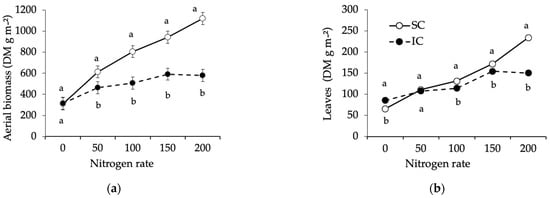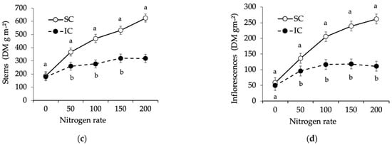 We chose N rates varying between 0 and 200 kg ha−1 because about 150 kg ha−1 is recommended for optimal cereal production in Central Italy [40]; besides, N rates up to 160 kg ha−1 did not modify the grain yield of field bean but conversely decreased its straw [43]. Thus, we hypothesized that these rates could exert distinct effects on forage and grain production of the legume.