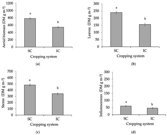 Additionally, we determined the distribution (%) of the produced biomass among organs, i.e., the proportion of leaves, stems, and inflorescences in total dry matter as: