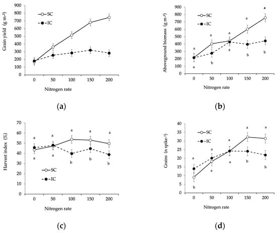 Averaged over N rates, the IC showed about 30% lower values of grain yield compared to those of the sole crops.