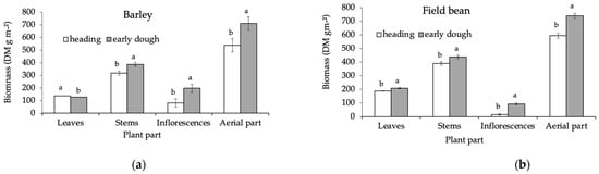 At full ripening of barley grains (BBCH 92) when concurrently field bean was at 40% ripening (BBCH 84), on 18 June 2015 and 14 June 2016, grain production was determined. Similarly, plants were manually cut at the ground level and divided into leaves, stems, and inflorescences (spikes or pods). Moreover, the number of inflorescences was determined, and mean grain weight was measured by counting and weighing them. Harvest index (HI) was calculated as the ratio of grain yield to total aboveground biomass at maturity.