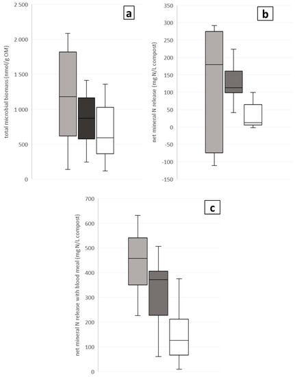 Total microbial biomass expressed on an OM basis (a), net mineral N release after 100 days of incubation for the composts without organic fertilizer (b) and the net mineral N release after 100 days for the composts with blood meal (c) for vegetable, fruit and garden waste (VFG) compost (light grey), green composts with higher initial mineral N concentrations (“Green compost, Nmin high”, dark grey box) and green composts with a lower initial mineral N concentration (“Green compost, Nmin low”, white box).
