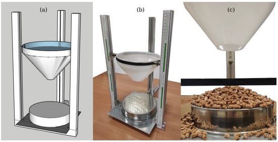 Although the angle of repose can be measured experimentally in several ways [32,33], “piling” is the most commonly used method. This involves storing a representative mass of the material in a funnel and allowing it to fall freely from the funnel outlet at a given height [34]. Since the angle of repose obtained needs to be accurate, several procedures and algorithms have been developed to obtain its value from images of the pile of material that forms during the experiment [35,36]. Piling assays for granular materials is based on the procedures described in different international standards [37,38]. However, none of these specify all the factors that could influence the angle of repose based on the size and shape of particles tested, such as the aperture of the funnel outlet, the distance through which the material falls, or the way in which the material is received on the base plate. Moreover, the particles generally considered in these standards are powders or quasi-spherical particles, while pellets are cylindrical.