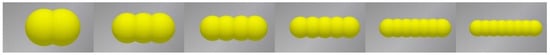 The discrete elements simulations were performed contemplating 1000–2500 particles. The shape of the pellets was obtained from an approximation to their real cylindrical shape using the multispheres method [45]. This generated particles as groupings of 2, 3, 4, 5, 7 or 8 spheres each with a diameter of 6 mm. The individual spheres used are partially overlapped in order to reach the desired lengths, and to approximately adjust their volumes to 250, 350, 450, 550, 650 and 750 mm3, respectively (Figure 2).