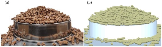 For the numerical simulations, a cylinder of radius 90 mm and height 20 mm was contemplated as a random particle generator. The generated particles were allowed to fall freely from a funnel with the same dimensions as used in the physical experiments. The funnel outlet was blockable via a limiting surface; when the particles were at rest in the funnel, the limiting surface was removed and the particles were allowed to pile on the plate below. The angle of repose was determined from the images produced when the pellets stopped falling. Simulations were repeated 5–10 times at different heights given the error inherent in the use of non-spherical particles, and to take into account the variation seen in the experimental assays. The numerical simulations performed aimed to reproduce the experimental tests carried out, as is shown in Figure 4.
