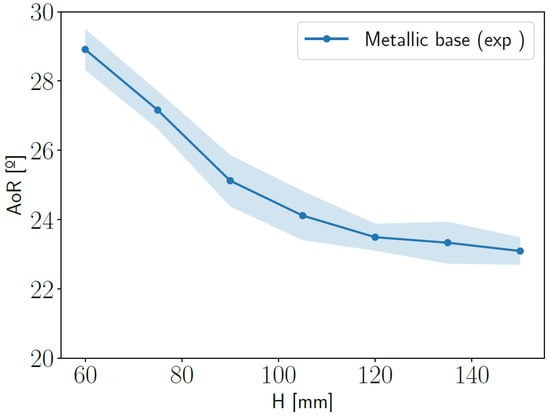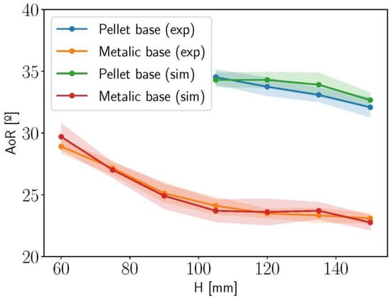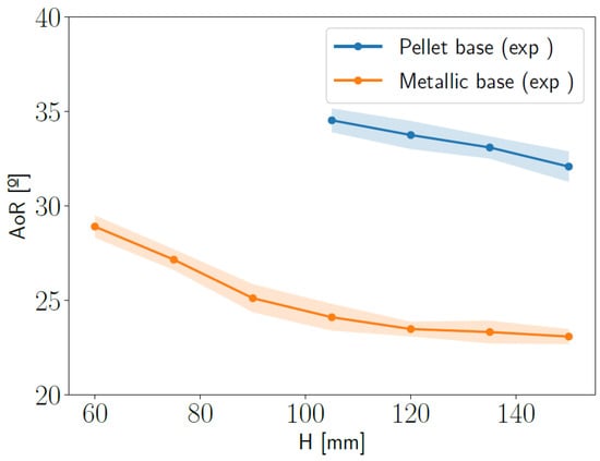 Figure 6 shows the values obtained for both bases (points represent means, shaded areas represents the standard deviation). For both, the angle of repose declined as the drop height increased. In addition, the dispersion of measurements for each drop height was small in both cases. However, the angle obtained with the pellet base was much greater than that obtained with the stainless steel base—about 10° for all drop heights. Consequently, the pile of material reached the outlet of the funnel, preventing the material flowing freely. Thus, no experimental measurements could be taken for drop heights lower than 100 mm for the pellet base experiments.