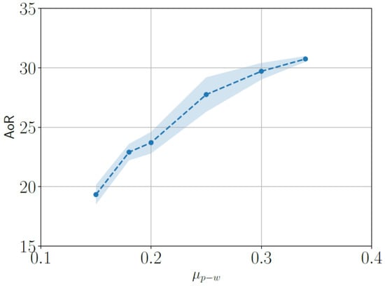 Figure 7. Variation in the angle of repose (AoR) for different particle-wall coefficients of friction (μp-w), for a metallic base and a drop height of 105 mm.