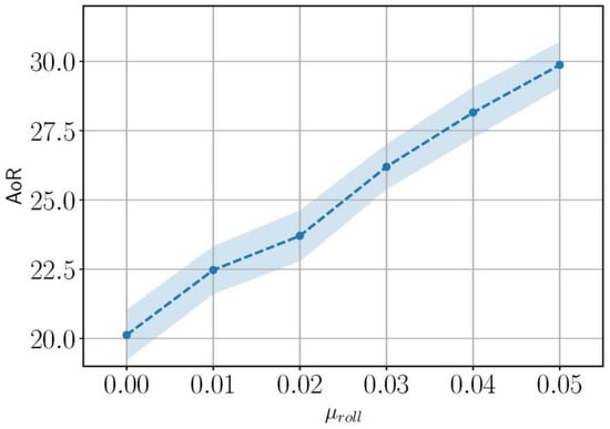 Figure 8. Variation in the angle of repose (AoR) with respect to the coefficient of rolling friction (μroll), for the metallic base and a drop height of 105 mm.