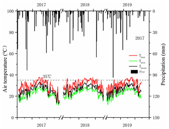 Meteorological data from 2017–2019. Tmax, Tmin, Tmean, and Pre are the maximum temperature, minimum temperature, average temperature, and precipitation, respectively.