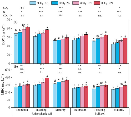 The dynamics of DOC and MBC concentrations at major stages during the summer maize growth period. Different letters indicate a significant difference (p < 0.05) between treatments in the same stage. Two-way ANOVA results are used to determine the significances and interactions among the effects of elevated CO2 (CO2) and N fertilization (N) on DOC and MBC concentrations (n.s., p > 0.05; *, 0.01 < p ≤ 0.05; **, 0.001 < p ≤ 0.01; ***, p ≤ 0.001). aCO2, eCO2, ZN and CN refer to ambient CO2, elevated CO2, zero N fertilization and conventional N fertilization, respectively.