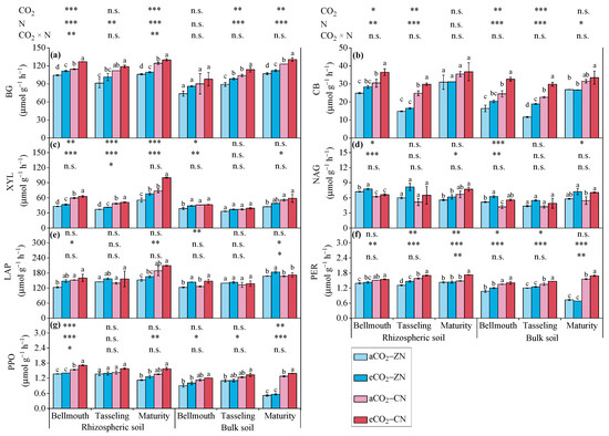 The dynamics of soil enzymatic activities at major stages during the summer maize growth period. Different letters indicate a significant difference (p < 0.05) between treatments in the same stage. Two-way ANOVA results are used to determine the significances and interactions among the effects of elevated CO2 (CO2) and N fertilization (N) on soil enzyme activities (n.s., p > 0.05; *, 0.01 < p ≤ 0.05; **, 0.001 < p ≤ 0.01; ***, p ≤ 0.001). aCO2, eCO2, ZN and CN refer to ambient CO2, elevated CO2, zero N fertilization and conventional N fertilization, respectively.