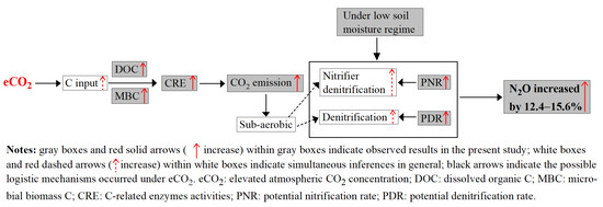 Through the comprehensive analyses on the possible conditions of N2O processes under eCO2, we draw the frame pathways on N2O emissions under eCO2, as shown in Figure 6. Generally, eCO2 increased available C inputs in the soil by C-deposition, thereby increasing soil labile C (i.e., DOC and MBC). This can stimulate microbial growth and soil extracellular enzyme activities (CRE) for catalyzing the decomposition of compounds such as DOC and so on, which accelerated the soil microbial respiration and, thus, soil CO2 emission. In turn, this might lead to sub-aerobic microsites favoring denitrification and nitrifier denitrification to produce more N2O. However, contrast analyses also found that instant environmental factors after fertilization, such as soil moisture, could influence the inter-annual variations and response of N2O emissions to eCO2. Hence, long-term continuous monitoring on N2O emissions under various hydrothermal regimes are greatly required based on the FACE platform, in order to understand the comprehensive role of eCO2 on N2O emissions under future climate change, with eCO2, rising temperature and staged drought as major properties. We also propose that a meta-analysis needs to classify the major influencing factors, including the soil hydrothermal index, in order to reveal the comprehensive characteristics of eCO2 on N2O emissions.