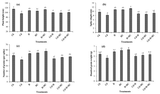 The influence of boron and biochar on plant height (a), spike length (b), number of grains (c), and 100-grain weight (d) of wheat under Cd stress, Ck control, Cd control stress, B boron, BC biochar, B+BC boron and biochar, Cd+B cadmium and Boron, Cd+BC cadmium and biochar and Cd+B+BC cadmium, boron and biochar. Different letters above the column indicate significance level among the treatments.
