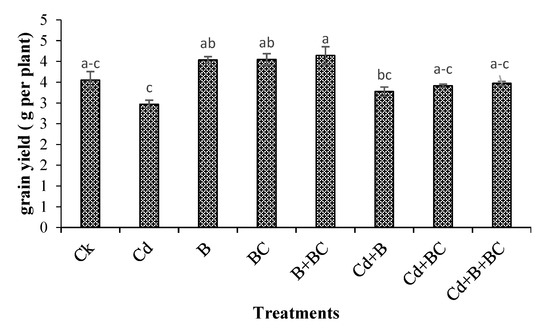The influence of boron and biochar on the grain yield of wheat under Cd stress, Ck control, Cd control stress, B boron, BC biochar, B+BC boron and biochar, Cd+B cadmium and Boron, Cd+BC cadmium and biochar and Cd+B+BC cadmium, boron, and biochar. Different letters above the column indicate significance level among the treatments.