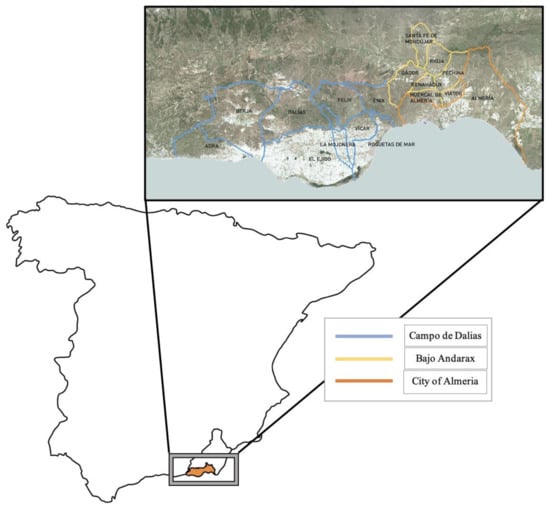 The present study was conducted in the province of Almería because of its representativity in the area. As it can be seen in Figure 1, it is a Mediterranean area located in southeastern Spain, because of its representativity. Its scarce annual rainfall, which is lower than 200 m, combined with a mean annual temperature of 18 °C, makes it a semi-arid area marked by high solar radiation [70]. Furthermore, available water for irrigation conditions its production and acts as one of the main limiting factors in one of the driest spots in Europe [71,72]. This area is well known for its key agricultural role, so much so that it has the highest concentration of greenhouses in the world and is the biggest exporter of fruits and vegetables in the whole of the European Union [73,74,75,76]. The constant growing demand on its agricultural products along with the already scarce water resources has led the province to a water deficit sustained over time [77]. Despite its characteristic high water productivity and the presence of a significant number of aquifers, due to the lack of constant water streams that enhance water collection, local aquifers have suffered much pressure after many years of being the main water resource used to irrigate [71]. With 60,699 total hectares cultivated in the 2019/2020 agricultural season and a medium surface of 3 hectares per farm, the overall number of farms in the area amounts to 20,233. Crops grown in the area are based on conductivity limitations in some irrigated areas since the high conductivity levels in some wells and aquifers narrow the possibilities. The system used to irrigate crops in the region has suffered an intense modernization in recent years due to localized irrigation, automated fertigation and tensiometers use, all of which improve the efficiency of the water in the area [74]. Irrigated areas are geographically divided among irrigation communities, which have different sources of water. This semi-arid region deserves special attention, as its case study can be extrapolated to other countries in a similar situation, especially those situated in arid and semi-arid climates, which also have several limitations regarding their water resources [78,79,80,81,82].