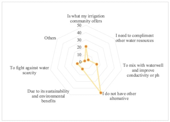The situation mentioned above was constantly referred to by the farmers surveyed during the part of the interview where they were asked about the reasons why they use reclaimed water. Their concern about whether this sustainable resource would be enough for all the farmer due to the depletion of underground water and its quality at unusable levels and the lack of any other water alternatives is highlighted in Figure 3, which shows the number of respondents that chose that answer. The most frequently chosen option for the reason they use reclaimed water was the absence of any other alternatives to irrigate crops. The next two options in terms of representativeness are also linked with the lack of alternatives, as what the irrigation community offers in the area, which is only reclaimed water, is due to the absence of other available options. Furthermore, there was a significant number of farmers that claimed that the reason they use tertiary water is to mix it with water from the water well, thus reducing conductivity or pH levels. These three reasons that justify the use of reclaimed water in the area are a very clear representation of the current situation, which is expected to worsen because of the lack of political support given to the agricultural holdings located in the area.