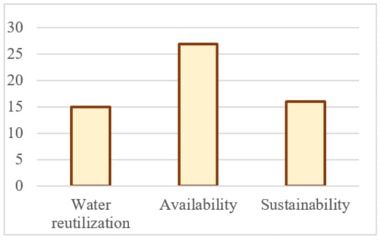 Farmers were also asked to mention perceived benefits and drawbacks of the use of tertiary water to irrigate agricultural corps and results, as shown in Figure 4 and Figure 5, which refer to the total number of farmers that has chosen that option. Although the repetition rate in the three options represented in both figures proves extended perceived beliefs by farmers, they are not always based on reliable studies or data since they are often biased by personal situations or experiences. Figure 4 shows that the most frequently repeated answer was the guarantee of having water available to irrigate their crops, a positive aspect derived from using reclaimed water, as has already been found in other research [54,65,95]. Sustainability and water reutilization are very close in terms of perceived importance, sustainability being understood as the implementation of a circular economy in the agriculture through the use of sustainable and respectful environmental practices. These two factors are directly connected, as reusing water instead of discharging it into water bodies is a sustainable practice that fosters the sustainability of natural resources. Other aspects that are also often noticed by users are the saving in fertilizers using reclaimed water and low levels of conductivity, compared with local water alternatives, that allow farmers to sow any crop. The levels of conductivity in reclaimed water in the local wastewater treatment plant were around 2.5 dS/m, while most water wells in the area had levels from 5 to 7 dS/m. It should be clarified that the ideal conductivity for the crops grown in that area is between 2 and 3 dS/m, as tomatoes, which is the most common crop in the area of study, needs higher levels than cucumbers or peppers.