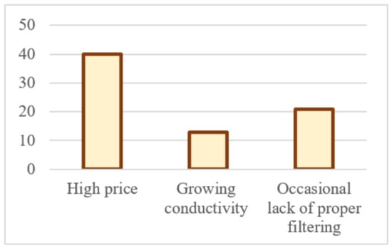 Drawbacks were also assessed by farmers, as shown in Figure 5, and the prevailing opinion is related with the high price of reclaimed water when compared with groundwater in the area of study, a problem already widely perceived by users in other studies [30,96]. Many agriculturalists refer to the importance of subsidising part of the cost of this resource to make it more attractive to new users. This is has already been accomplished with other water alternatives as many desalinated plants are the property of the government so it subsidises the price of desalinated water, making it lower for the farmer. Subsidising the price of reclaimed water for agricultural use is already implemented in other countries, such as Cyprus or the USA (California) where the public administration front a great part of the water price [97]. Respondents also referred to the occasional lack of proper filtering, which, although becoming less and less frequent, still affects some agricultural holdings by clogging their filters. Lastly, increasing conductivity was referred to as a significant drawback by those farmers who mix water from the water well with reclaimed water to obtain conductivity levels suitable for the crop. Nevertheless, although current reclaimed water conductivity levels are adequate for all the crops sown in the area, farmers with their agricultural holdings nearby water wells with excessively high levels of conductivity need another water source with very low levels that would compensate for this factor.
