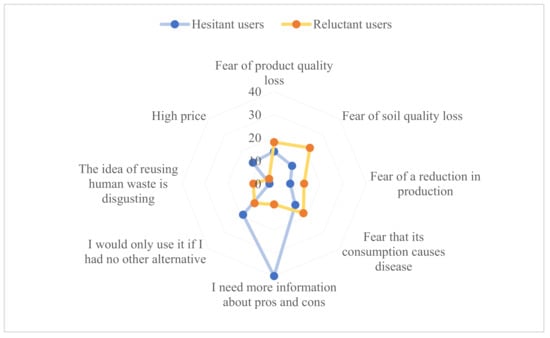 Figure 7, which refers to the total number of farmers that chose that option, compares the reasons given by hesitant users that make them uncertain about whether to use reclaimed water or not with arguments from reluctant users that justify their refusal to use this sustainable resource if they could. The first group of users also referred to the high price of this water alternative. While a great number of hesitant users would probably change their minds with proper information about advantages and disadvantages or would simply use it in the case of the absence of alternatives, reluctant users’ hesitations are based on fear. The idea of losing soil or product quality or diseases derived from the consumption of a product irrigated with reclaimed water are the most recurrent worries. To eliminate as well as prevent fears and misconceptions, informational campaigns have already been stated as key in the role of encouraging farmers to use tertiary water [50,57]. It has to be underlined that the yuck factor mentioned in many articles, which refers to the disgusting image that reusing human waste may have, is of minimum importance to these farmers as they are used to applying organic fertilizer from animal disposals [55].