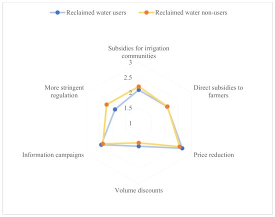 At the end of the questionnaire, the farmers surveyed were asked to evaluate the effectiveness of different incentives that could be put into effect in order to promote the use of reclaimed water to irrigate agricultural crops. Similar patterns of opinions are shown in Figure 8, which existed regardless of whether the farmer had or had not previously used reclaimed water for irrigation. This figure shows in terms of importance, from 1 to 3 (1—not important at all and 3—really important) with intervals of 0.5, how users perceive certain policies and their capacity to promote the implementation of reclaimed water for watering crops. In terms of cost reduction, the option of a price decrease overruled subsidies, whether it be for farmers or irrigation communities. Information campaigns about the benefits derived from its use, along with price reduction, were the options chosen by the greatest number of farmers. Both aspects have already been stated in previous research [66,67]. For its part, the volume discount was the least desirable measure for fostering the use of reclaimed water as farmers see the proposal as a disadvantage for farms with small surface areas and for those focused on saving water, as this measure would lead to its wasteful consumption to receive volume discounts. Nevertheless, although opinions are quite similar between the two groups studied, there is an aspect where there is a greater discrepancy. While agriculturalists who have never used reclaimed water believe that more stringent regulation is necessary, users have more knowledge about how strict the regulation already is. This difference confirms and reinforces the already perceived idea that information campaigns are a key measure of progress in the task of promoting reclaimed water for crop irrigation.