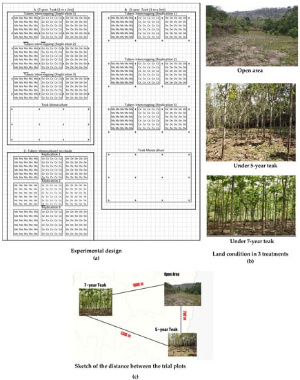 (a) Experimental design of three shade-resistant tuber species (Ma: Maranta arundinacea, Ce: Canna edulis and De: Dioscorea esculenta) in three planting patterns (A = 7-year teak; B = 5-year teak; and C = tuber monoculture or open area); X = teak monoculture); (b) field condition before planting and (c) sketch of the distance between trial plots.