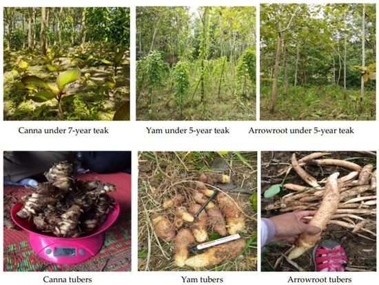Optimizing land with food crops is expected to increase food production []. In general, many types of food crops are cultivated in open areas, but some tuber species (arrowroot, canna and yam) are able to grow under the tree shade from 30% to 70% [,,,,]. Tubers (arrowroot, canna and yam) are usually planted in agroforestry system under the trees by the local community []. This tropical and perennial tuberous plant was underutilized despite its potential as an alternative food source [,]. Arrowroot is a low-light adaptive plant [,]. Arrowroot survives poor light environment and infertile land, characteristics that are required for a shaded place []. Yam grows at 60–70% light intensity [], while canna is drought resistant and suitable for cultivation under shaded area with low light intensity []. The highest production of canna tubers was in 50% shade []. The ideal management of annual and perennial crops in an agroforestry system varies by biophysical, economic and social conditions [].