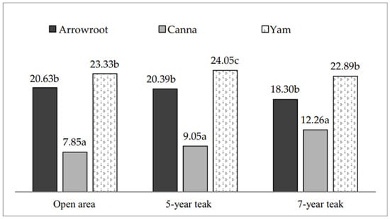 This study attests arrowroot suitability at elevation of 230 m a.s.l., with rainfall of 2300 mm/year and dry rocky soil (without irrigation). Water greatly affects plant metabolic processes, either directly or indirectly []. In Madura Island (Indonesia), with very low rainfall (1202 mm/year) and very low soil nitrogen content, the potential of arrowroot production is only 2.65 Mg/ha []. Arrowroot has been planted in Indonesia a long time ago, with a production variation of 7–47 Mg/ha []. The low productivity of arrowroot in Gunungkidul is mainly caused by dry land; therefore, it depends on rainwater []. Arrowroot tuber is a starch, with starch production potential equaling to 1.92–2.56 Mg/ha []. In this study, arrowroot production was relatively high in the open area (26.64 Mg/ha) and had limited production under 5-year teak (6.21 Mg/ha) and below-the-standard production under 7-year teak (2.94 Mg/ha). Arrowroot productivity will be lower along with higher teak density []. The carbohydrates content on arrowroot tubers in teak dense places is similar to open areas. Physicochemical and nutrient content of arrowroot is not significantly different between monoculture and intercropping []. Although a previous study indicated that arrowroot was a shade-resistant species productive at light intensity of 30–56% (Table 5), in this study its growth and tuber production decreased under the teak shade. The limiting factor for arrowroot production was light intensity.