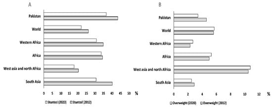 Prevalence of undernutrition (A) and obesity (B) in children under five years of age in Pakistan and other global regions during 2012–2020, data extracted from FAO 2021 [13].