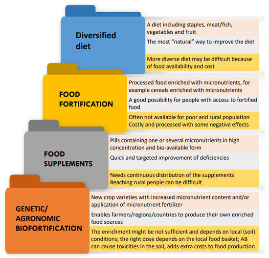 Along with fortification of food during processing, increased diversity of food including staple grains, fruits, and vegetables can provide a balanced and appropriate combination of macronutrients, vitamins, and minerals. Different food groups, their suitability for fortification along with successful examples are listed in Table 2, however, poor people in developing countries often have financial or agricultural limitations to access them. Therefore, biofortification of staple crops with micronutrients is considered a promising way to combat malnutrition. It is a cost-effective and easily approachable strategy with minimal complexities of regulations. Nevertheless, nutritional education is needed to understand the different nutritional values of food to make it more successful [7].