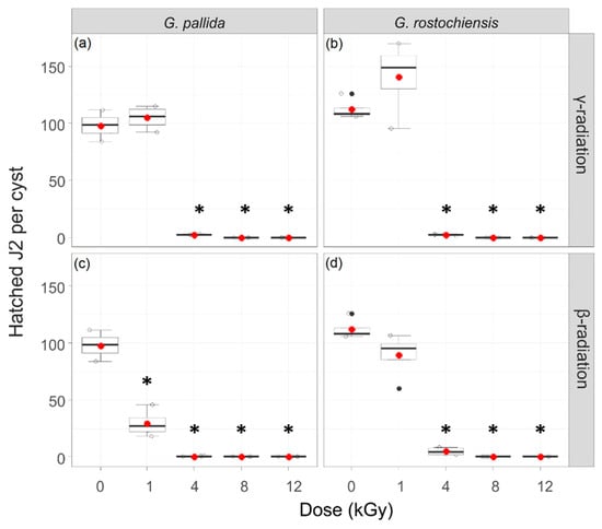 Hatching test for G. pallida and G. rostochiensis γ and β irradiated cysts. Total number of hatched juveniles (J2) per cyst over a period of seven weeks for 0, 1, 4, 8 and 12 kGy γ irradiated G. pallida (a), γ irradiated G. rostochiensis (b), β irradiated G. pallida (c) and β irradiated G. rostochiensis (d) cysts. Data were analysed by the non-parametric Kruskal–Wallis test with the pairwise Wilcoxon post hoc test using adjusted p-values. Box–whisker plots display the median and mean (red dots) values of four replicates with 20 cysts each. Asterisks indicate the significant differences to the respective non-treated controls.