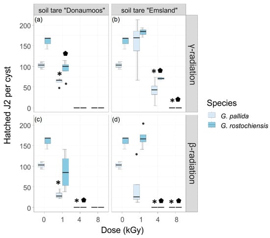 Hatching test for G. pallida and G. rostochiensis γ and β irradiated cysts in soil tare. Total number of hatched juveniles per cyst over a period of seven weeks for 0, 1, 4 and 8 kGy γ irradiated G. pallida (a,b) and G. rostochiensis (a,b), β irradiated G. pallida and G. rostochiensis (c,d) cysts placed in soil tare “Emsland” (b,d) and soil tare “Donaumoos” (a,c). Data were analysed by the non-parametric Kruskal–Wallis test with a pairwise Wilcoxon post hoc test using adjusted p-values. Box–whisker plots display the mean values of four replicates with 20 cysts. Asterisks indicate significant differences to the respective non-treated G. pallida and diamonds to the respective non-treated G. rostochiensis controls.