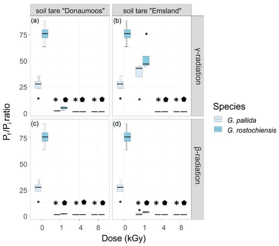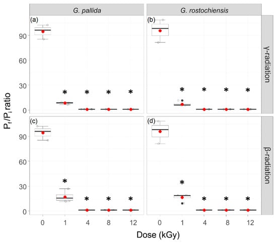 Cyst formation rates of irradiated G. pallida and G. rostochiensis. The ratio of newly formed cysts Pf (final population) and the number of (Pi) initial cysts (50) added to the susceptible potato cultivar “Desiree”, 15 weeks after planting. Pi cysts were treated with 0, 1, 4, 8 and 12 kGy of γ irradiation (a,b) or β irradiation (c,d). Data were analysed by the non-parametric Kruskal–Wallis test with a pairwise Wilcoxon post hoc test using adjusted p-values. Box–whisker plots display the median and mean (red dots) values of four replicates. Asterisks indicate the significant differences to the respective non-treated controls.