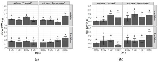 (a) Shoot and (b) root dry mass of four-week-old Zea mays seedlings growing in γ irradiated (upper panels) and β irradiated (lower panels) soil tare “Emsland” (left panels) and soil tare “Donaumoos” (right panels). Bar plots indicate the mean values and standard deviation of four replicates per treatment. Data were analysed by ANOVA Dunnett´s post hoc test. Lowercase letters indicate the significant differences of shoot (a) and root (b) dry weights compared to their respective controls (0 kGy), (p ≤ 0.05).