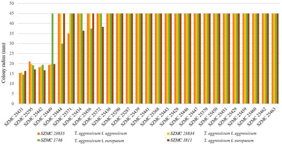 Confrontation assay performed between Trichoderma aggressivum strains and Bacillus isolates. A colony radius of 45 mm means no inhibition and full coverage of the yeast extract–sucrose agar (YES) plate by the fungal colony after 3 days of incubation at 20 °C.