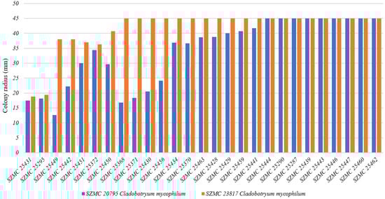 Confrontation assay performed between Cladobotryum mycophilum strains and Bacillus isolates. A colony radius of 45 mm means no inhibition and full coverage of the yeast extract–sucrose (YES) agar plate by the fungal colony after 3 days of incubation at 20 °C.