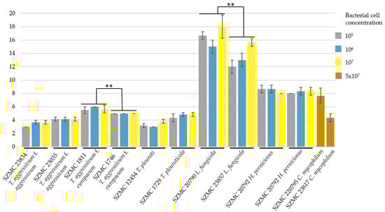 Inhibition zones on the continuous fungal layer are shown in Figure 3. Based on our findings, the treatment with the B. velezensis SZMC 25431 isolate could inhibit all tested mushroom pathogenic mold strains, although in different concentrations and with varying efficiency. The bacterial cell concentrations had no effect on the size of the inhibition zones in the cases of T. aggressivum f. aggressivum SZMC 23035, Trichoderma aggressivum f. europaeum SZMC 1746, and the two C. mycophilum strains (SZMC 20795 and SZMC 20817). The Trichoderma strains seemed to react to a similar extent with relatively small differences. The T. aggressivum f. europaeum isolates (SZMC 1811 and SZMC 1746) proved to be more susceptible than the T. aggressivum f. aggressivum strains (SZMC 23834 and SZMC 23035). The bacterial suspension also inhibited the mycelial growth of the oyster mushroom pathogens T. pleuroti SZMC 12454 and T. pleuroticola SZMC 1729 strains. The T. aggressivum f. europaeum isolates displayed the largest inhibition zones with an average of 5 mm in all replicates.