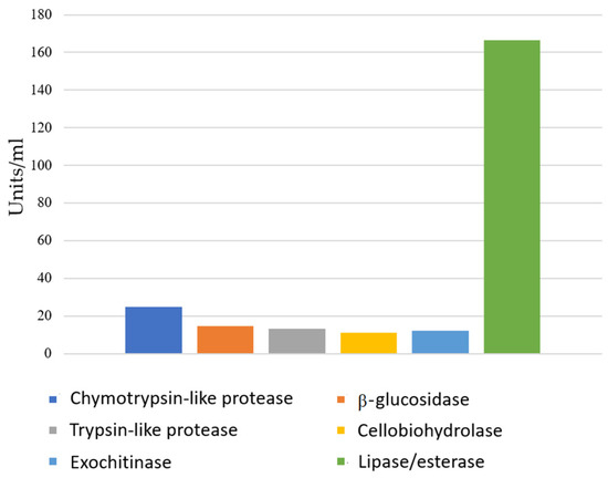 The extracellular enzyme activity data of the investigated strain are presented in Figure 4. According to our results, this bacterial strain produces every type of enzyme activity investigated, with lipase activity being the most dominant.