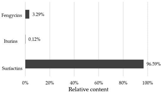 Relative lipopeptide production of Bacillus velezensis SZMC 25431 expressed as percentages of the total amount.