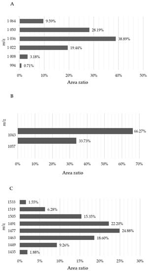 Relative lipopeptide production of Bacillus velezensis SZMC 25431 expressed as percentages according to the molecular weights of their protonated molecular ions ([M + H]+). (A) Surfactins, (B) iturins, and (C) fengycins. m/z: Mass-to-charge ratio.