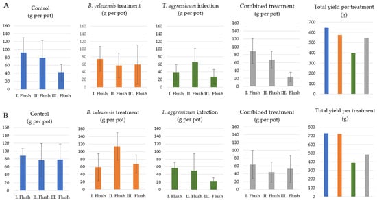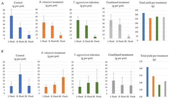 Effect of different treatments on the crop yield of Agaricus bisporus grown in pots during the 3rd (A) and 4th (B) experiments in plant growth chamber. Control: without Bacillus/Trichoderma inoculation; Bacillus velezensis only at 104 cells g−1 of casing (A,B); Trichoderma aggressivum at 106 cells g−1 of casing (A,B); combined treatment: B. velezensis + T. aggressivum at 104 + 106 cells g−1 of casing. Total yields for each treatment represent the sum of yields of the 3 replicates across 3 flushes.
