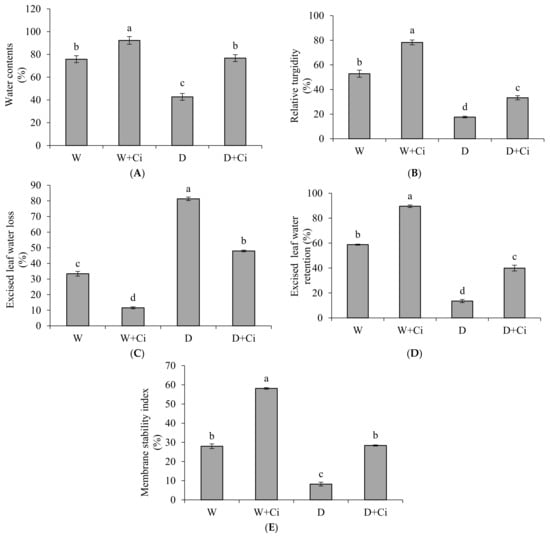 (A) Water contents; (B) Relative turgidity; (C) Excised leaf water loss; (D) Excised leaf water retention; and (E) Membrane stability index contents of Calendula officinalis affected by foliar application of chitosan (7.5 mg L−1) weekly at 100% and 60% FC. Letters above the bars represent significant differences at p < 0.05 according to LSD test. W, normal conditions (100% FC); W + Ci, chitosan under normal conditions; D, drought stress without chitosan (60% FC); D + Ci, drought stress with chitosan (each mean consists of 3 replicates).