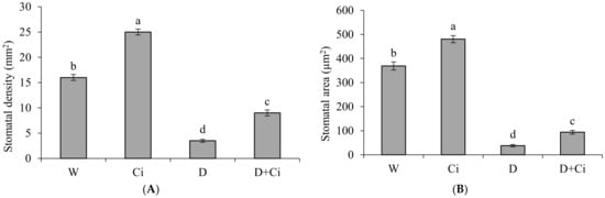 (A) Stomatal density and (B) stomatal area of Calendula officinalis after foliar application of chitosan (7.5 mg L−1) weekly at 100% and 60% FC. Letters above the bars represent significant differences at p < 0.05 according to LSD test. W, normal conditions (100% FC); W + Ci, chitosan under normal conditions; D, drought stress without chitosan (60% FC); D + Ci, drought stress with chitosan (each mean consists of 3 replicates).